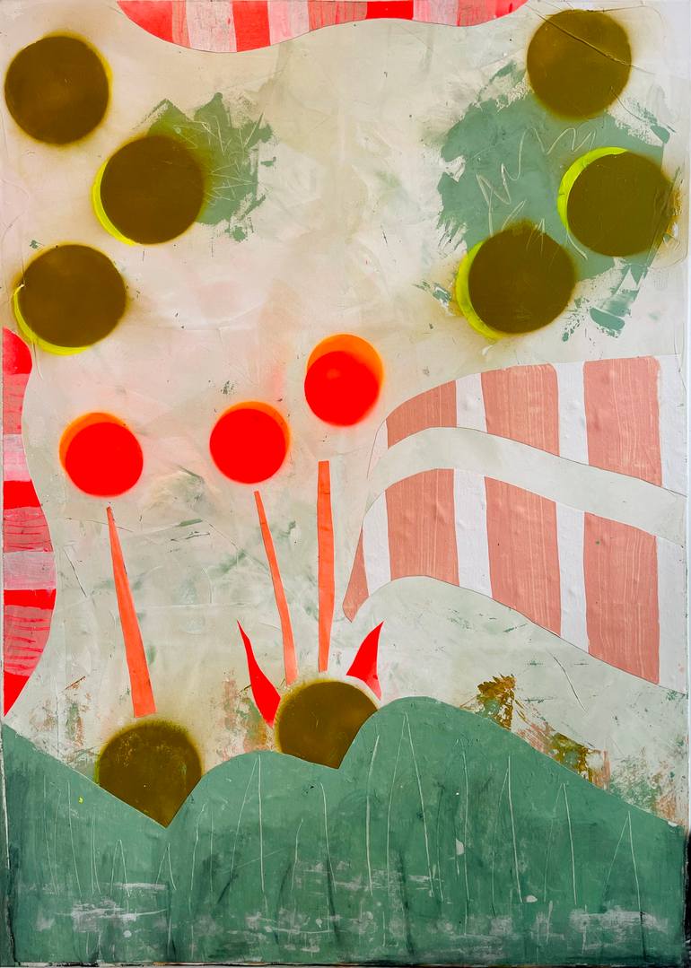 This work reflects a powerful joy of life, captured by the vibrant red flowers dancing on a vibrant turquoise-green field. We worked with acrylic, collage elements and spray paint to create a dynamic, semi-abstract scene that exudes both calm and visual tension. This image is intended to inspire vie...