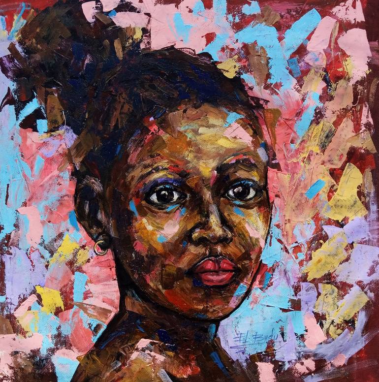 Ernest Larbi Budu is a contemporary Ghanaian artist. Growing up as the only artist in his family and in a town where art wasn’t well received by the majority, this did not stop him from pursing his dream of becoming a professional artist. After receiving a degree in Art Education, he works as a creative art teacher while exploring his painting ideas and style on canvas. He work on variety of themes which includes abstract concept, landscapes, flora and fauna, portrait, culture and life struggles in Africa. His unique technique seeks to explore the phenomenon of wild colour effect. Inspired by the simplicity and the complexity of bright colours in nature and its effect on the human soul, his works are full of dramatic and vibrant colours in a way that excite and engage the viewer. He also incorporates Ghanaian cultural symbols and artefact like the African mask, Traditional Adinkra symbols into his paintings to reveal his cultural identity and root. From his own words: I allow the brush, pallet strokes and colours to move with respect to the form and shape of my subject. The fascinating outcome of my paintings is a power which directly influences the viewer’s soul and therapeutically enhancing positive emotions. He believes art is the expression of emotions of the soul than a mere imitation of nature. He often paint portrait of children and women in Africa revealing their hopes, aspirations, sensations and the contours of their life struggles emanating from living in the African space. His hope is that people enjoy the beauty and the inspiration of his creation. paintings are in numerous private collections in Canada, Germany, United States, Belgium, Denmark, Japan, Netherlands and U.K