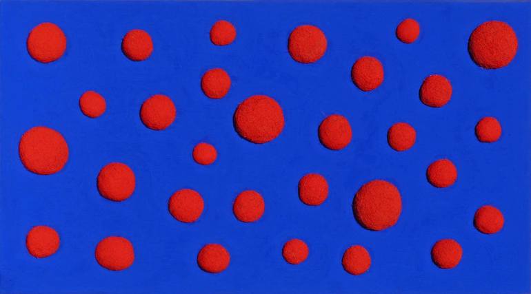 Unique contemporary art piece: “Red on ultramarine blue”...the seagrass balls painting in ultramarine and red. Wonderful art installation/painting with natural elements and dry pigment. Live it looks fantastic - one of a kind piece! The balls are original natural sea balls (commonly known as Nep...