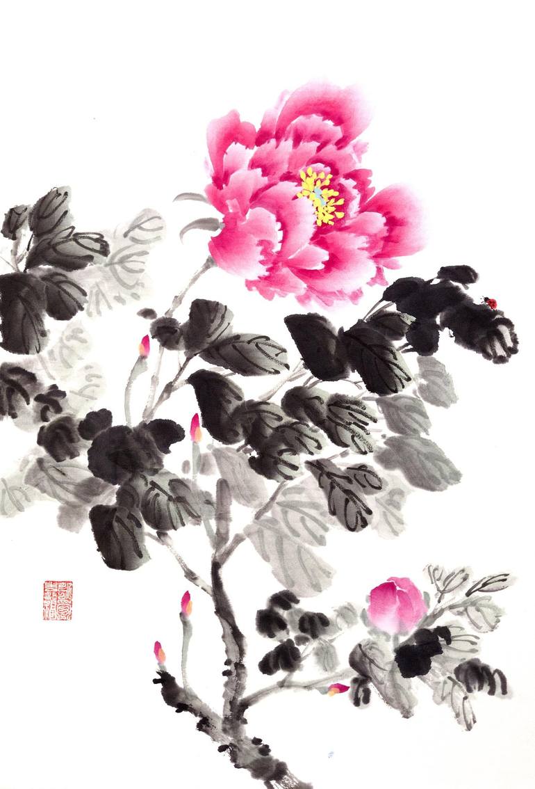Red peony and ladybug - Oriental Chinese Ink Painting Painting