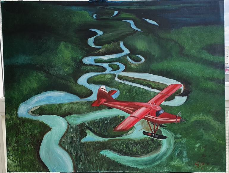 Being quarantined because of the virus pandemic, I wanted to feel nature in its most favorite manifestation, I wanted to draw a forest. Deep, green, with a forest river. And the red plane means overcoming all obstacles. The painting is made on oil canvas.