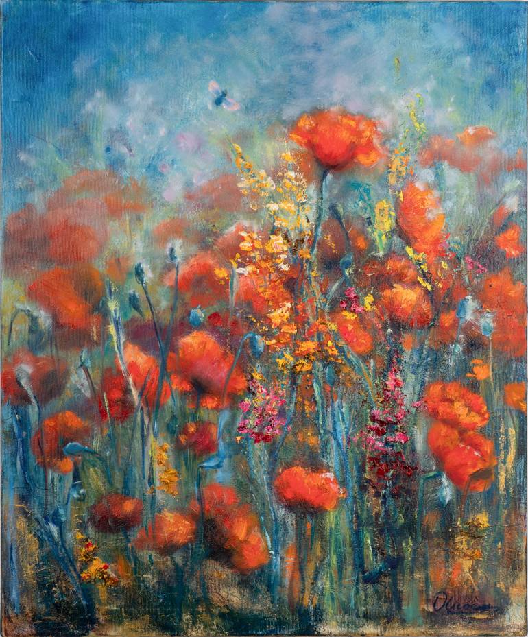 My work of authorship, written by me in 2020. Oil painting on cotton canvas, canvas on wooden stretcher. Summer wildflowers are pleasing to the eye at any time of the year. Red poppies against the blue sky, summer evening, bee. The whole composition pacifies and gives pleasant warm feelings. The pic...