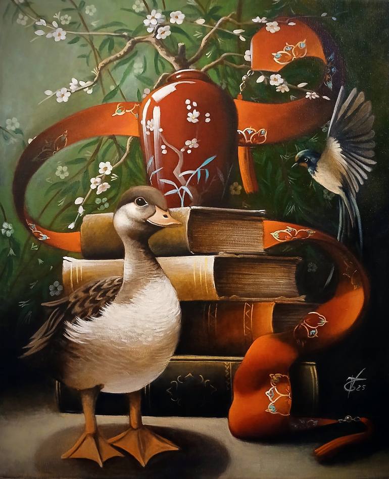 In this painting, I've blended elements of surrealism with vibrant acrylics to create a whimsical scene that invites the viewer into a fantastical narrative. The central figure, a charming duck, stands confidently among overflowing books and an intricate red scarf, symbolizing the journey through kn...