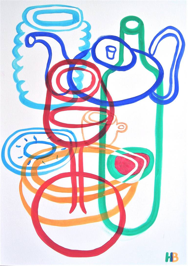 This still life is inspired by minimalism, distortion of lines and the search for new forms. The transparency of individual object creates an original composition. The glass of red wine is dominated... The painting is drawn by tempera and acrylic on white canvas.