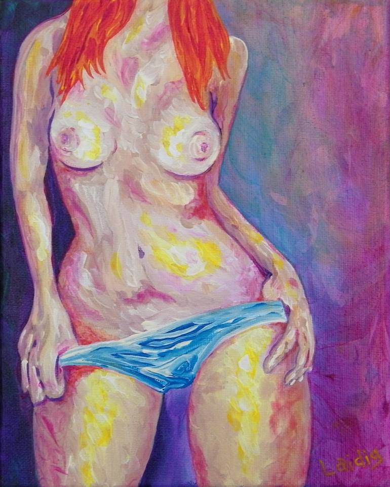 Small acrylic on canvas painting of a ginger girl starting to take her panties down.