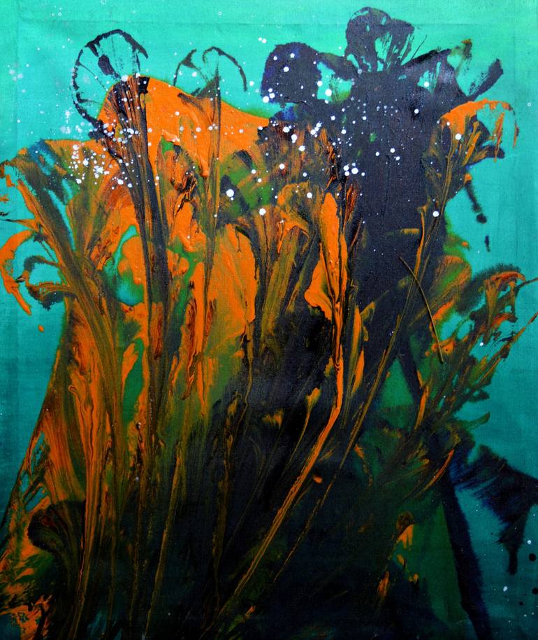 Reeds of bright and dark orange sway in the light waves beneath the tropical ocean that houses a reef lighted in turquoise hues. The mystic color of the reef is skillfully brought through with a gradient of turquoise backdropped over the stunning array of amber reeds. The creator has used splatteri...