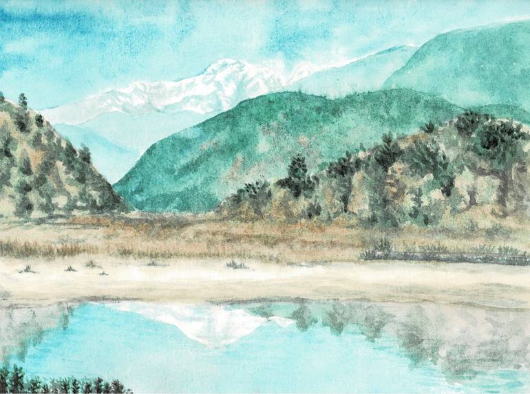 A peaceful composition capturing the grandeur of a tall snow mountain standing proudly in the background, with a second tree-lined mountain nestled below it. Calm waters stretch out beneath, mirroring the serene landscape above in soft, shimmering reflections. The clear blue sky with some white clou...