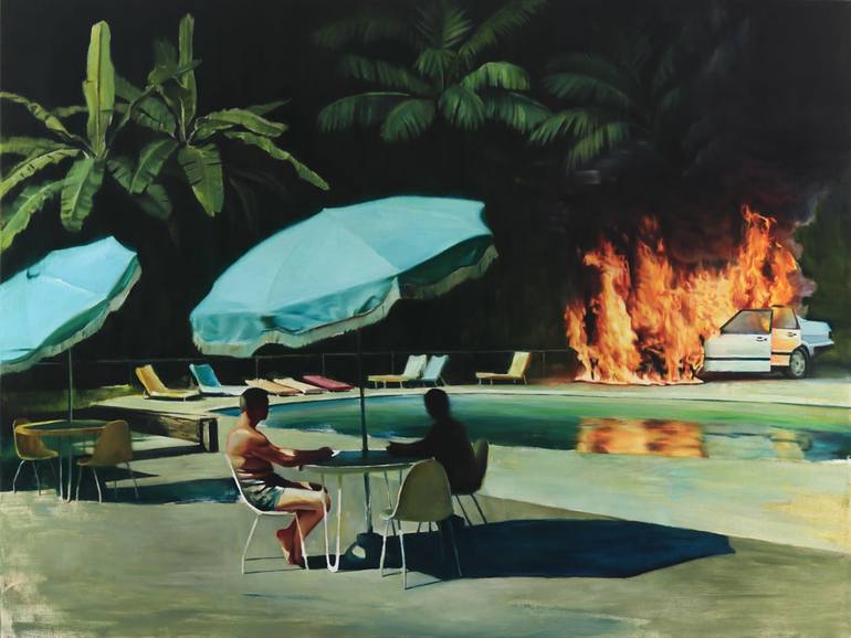 Two figures sit at a table under the shade of an umbrella next to a swimming pool, while a car burns in the background.