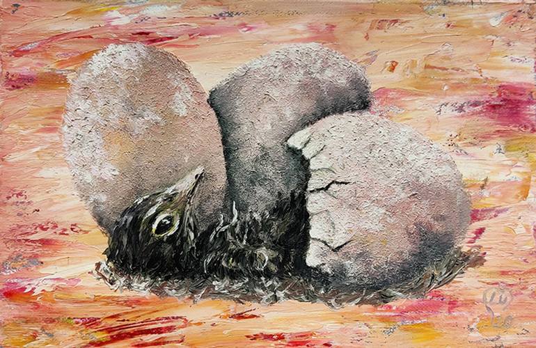 "Hatching Chick" is an oil painting that captures the moment of birth of a small baby chicken. The artwork depicts the hatching chick with undeveloped grey feathers and gives a sense of its fragility and vulnerability. The background of the painting is bold and striking, with a rough texture that is...