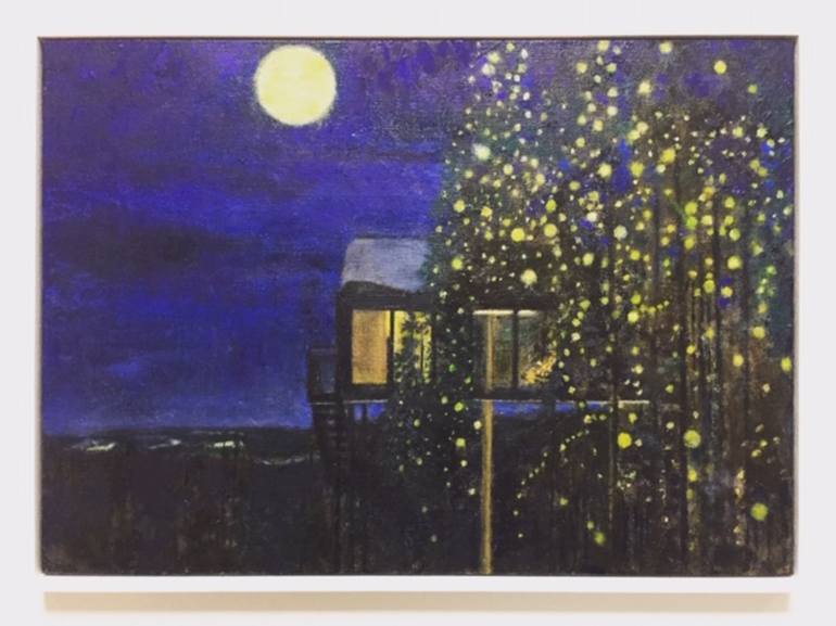 mysterious image of a tree house in a forest under a huge full moon...A surreal image..
