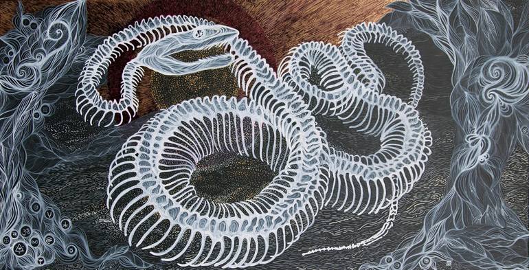 This painting is from the cycle Reminiscences of lost knowledge. Symbols taken from different cultures and believes are on the patterns around the snake. Besides used symbols , the skeleton is also an emblem of this what is left from the old wisdom.