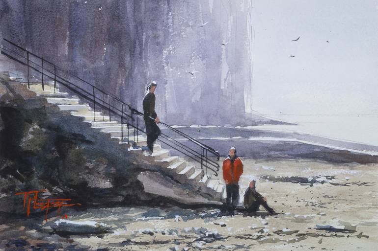 People meet at the stairs down by the cliffs at Bois de Cise, Picardie, France