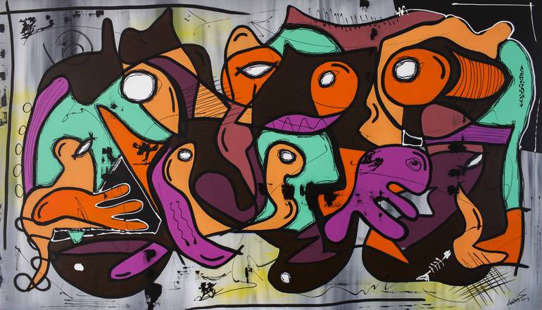 Responsibility is a modern abstract painting on canvas. this painting is a big painting from the serial Fiction elements. This series of paintings by Christian van Hedel also belongs to modern art. Balanced lines, stripes, stains of bright colors against a gray background are projected on linen in ...