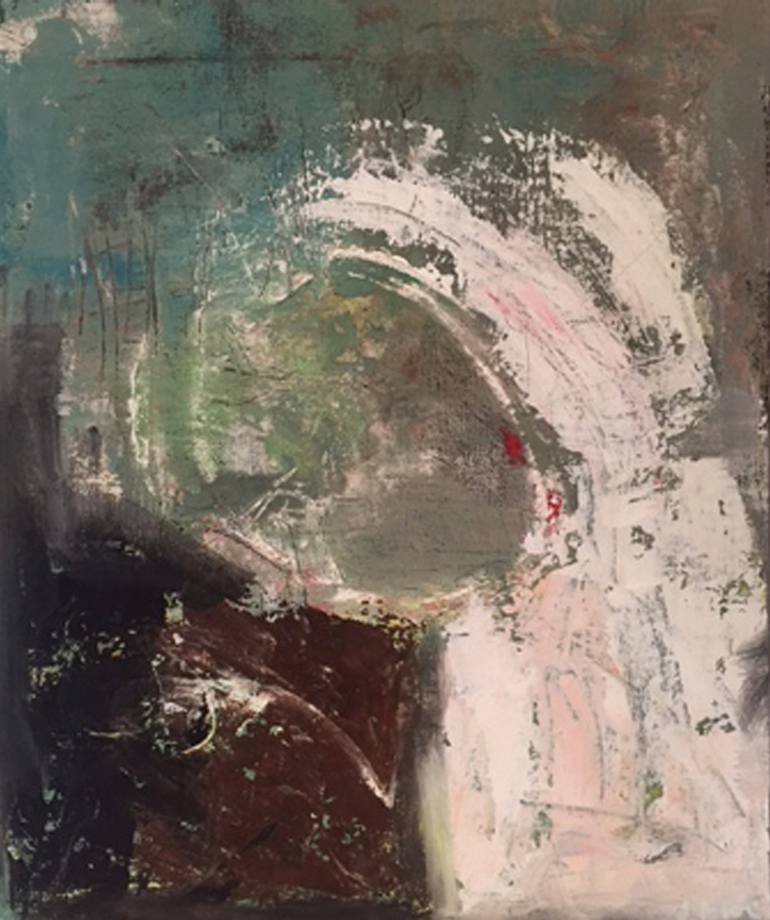 Oil, tempera and acrylic painting that gives a sincere feeling. Soft tones in pale off-white and different pink colours to dark brown. Thick in texture. The painting is sold.