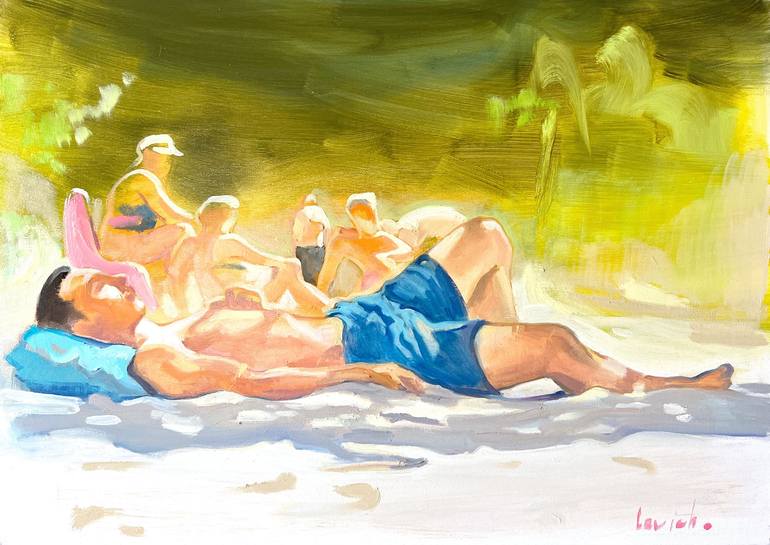 In the piece "Resting Faun," Levich brings to the fore the timeless beauty of a beach interlude. The subject, sprawled on the sands, is a study in relaxation, their form a contrast against the vibrant beach scene. This oil painting stands as a snapshot of summer’s relaxed ethos, a tableau of the sim...