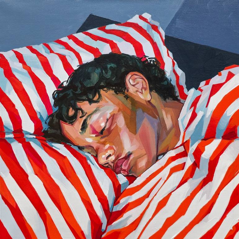 This piece captures a figure resting in a posture of calm and surrender, surrounded by the energy of red and white stripes that traverse the composition. These stripes are not merely decorative but a visual device that brings dynamism and structure, contrasting with the serenity of the figure. Each...