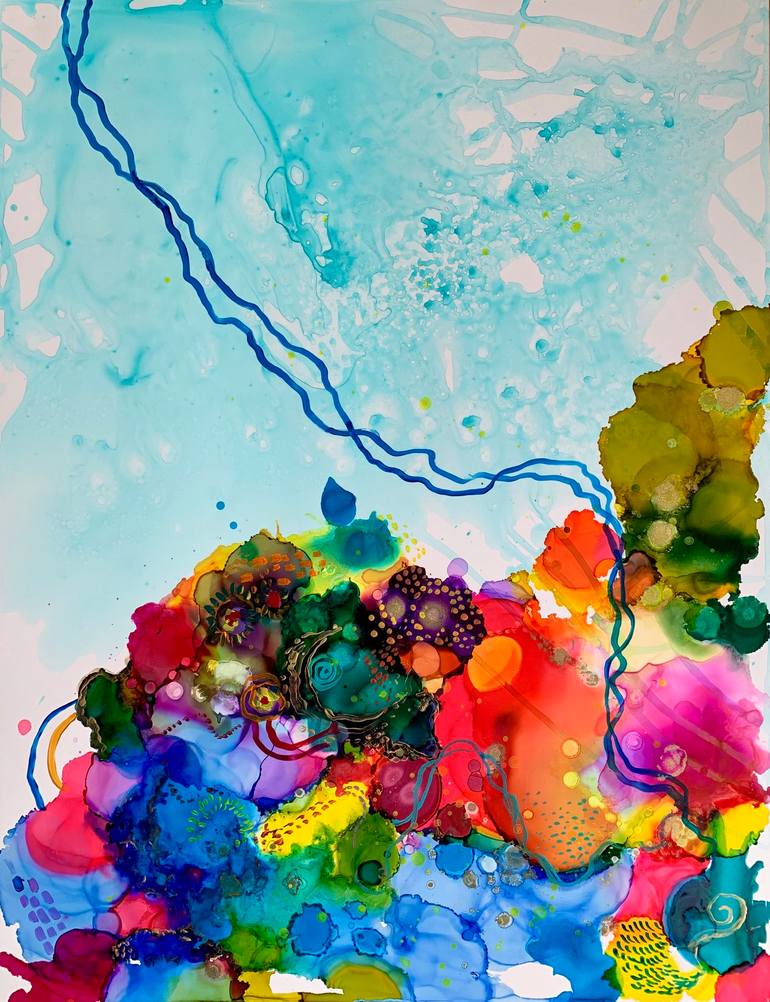 I love traveling and snorkeling. I also love exploring the ocean and the undersea world is a perfect environment for color exploration. I was inspired after our family trip to St.Martin and when we came back I created this piece. I used inks and mixed media on paper. It has a beautiful gold frame wi...