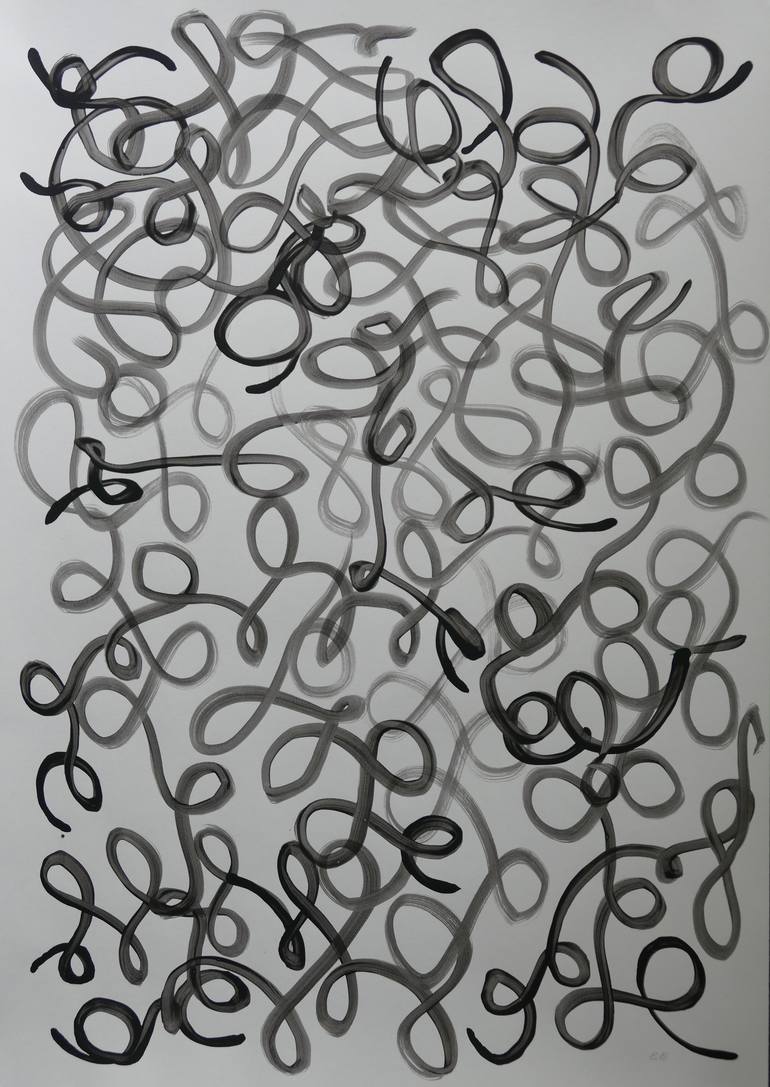 The artwork is the result of a mood, a rhythm expressing patience, humor, and the attempt to crochet using a brush. In reality the black loops don't hook into each other on the paper though the impression is three-dimensional by the shades. Thus, the outcome is rather a long, loose thread in curls t...