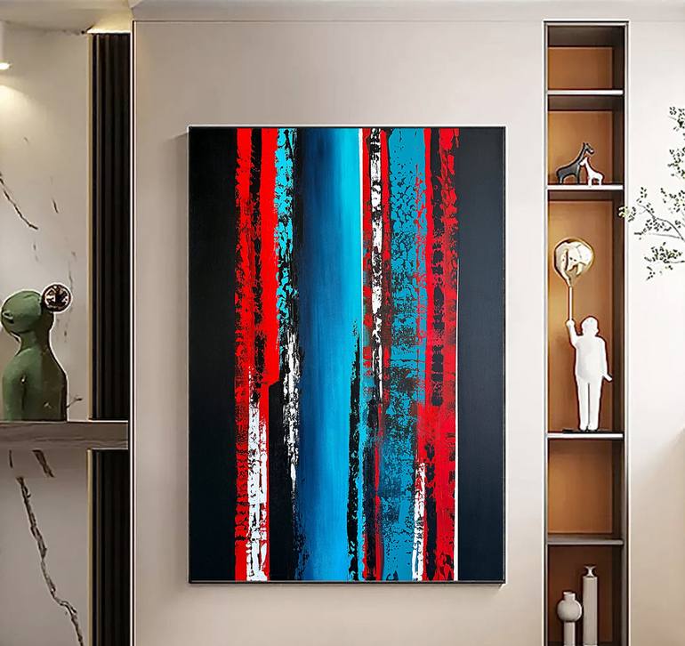 This painting is a manifestation of energy and movement, created in the technique of abstract expressionism. The canvas is filled with powerful contrasts: vibrant crimson red, deep sky blue, and solid black combine to form a dynamic composition. The lines and textures are applied with a palette knif...