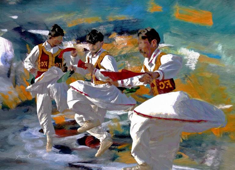 This vibrant painting captures the dynamic movement and cultural essence of the traditional Attan dance, native to Afghanistan and the Pashtun regions. The dancers, dressed in traditional attire, are caught mid-step in a synchronized, graceful motion. Their bright clothing contrasts with the impress...