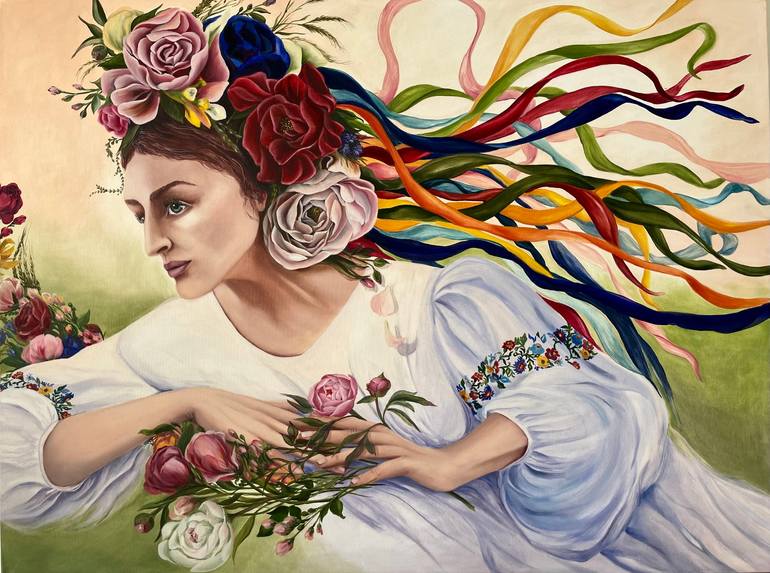 Oil on canvas on a stretcher 90*120 cm 2023 A wreath woven from flowers and herbs, decorated with bright ribbons, is one of the oldest Ukrainian symbols, and the image of a Ukrainian girl is impossible without a head beautifully crowned with flowers. Ribbons were measured along the length of the b...