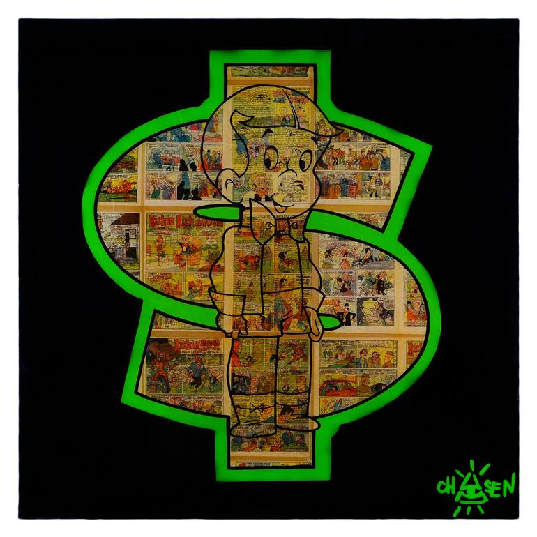 My work represents a contemporary reinterpretation of the legacy of iconic pop art masters, infused with my own conceptual perspective. Each piece draws upon the visual language of Andy Warhol’s cultural symbolism, Roy Lichtenstein’s graphic narratives, the layered collages of Robert Rauschenberg, the raw expressiveness of Jean-Michel Basquiat, and the dynamic spontaneity of Jackson Pollock, while weaving in a multitude of other cultural references. I explore the tension between opposites, merging rare vintage materials — such as mid-20th century newspapers, comic books, and stock certificates — with modern artistic media including spray paint, acrylics, markers, and inks. Accents of gold leaf, authentic banknotes, and epoxy resin elevate each composition into a multidimensional art object. Within my visual universe reside distinctive characters of my own creation, inspired by and evolving from well-known comic book icons. This synthesis of influences, materials, and personal invention results in works that are immediately recognizable, unmistakably original, and singular in the global art landscape.