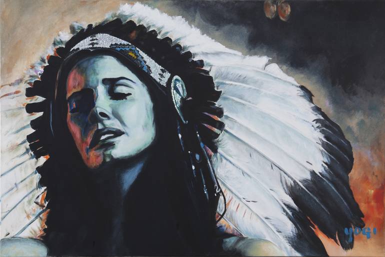 This was inspired by my eldest daughter Bella. She wanted a painting of Lana Del Rey for her room. I have always had a love of all things native american and chose the headress image. After trawling the internet I came across a video clip which I stilled at random. I loved the way the firelight l...