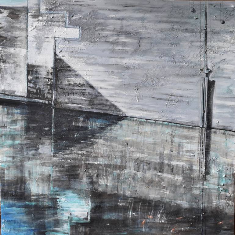 I would suggest with the color and the geometric shape the peace of this landscape. The water inspire calm and peace I'd like the simple shape of the architecture and the soft shadow the perpendicular line and the light reflect into the water. The red fish represent the nature and its perfect harmon...