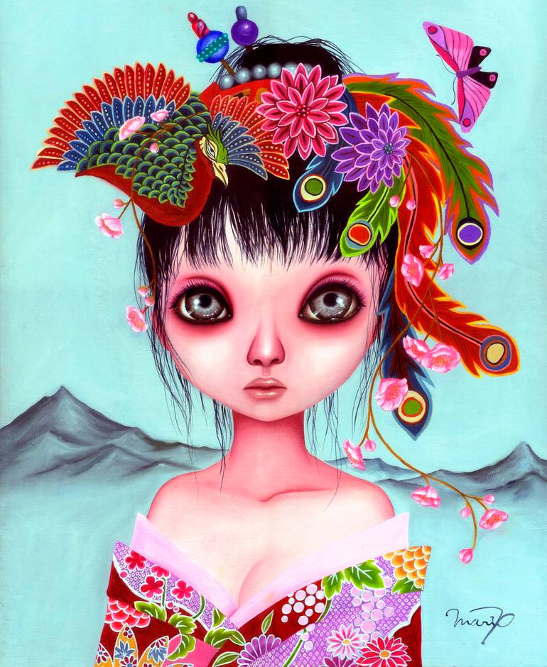 Born in Kyoto, Japan.Mari is an award winning artist who stage regular solo exhibition around Japan.Mari's works has been accepted for major exhibition since 2004 in Europe & NY,as well as in regular group exhibition in Australia.What I'm trying to express in my art are my experiences which are like pain, pleasure, sadness, and impressed scene. And various cultures and ideologies are included. In addition, it was filled with the dirty part that is existed in a deep inner and the hidden other side. They are dismantled once, restructured, and represented by the big eyed punk nymphets, my Alter ego. Therefore, my art is always impulsive, private and is free. An imaginative extraordinary world is composed by the oil paints or uniting of different textures. Many junk elements collected from all over the world are mixed, and the color flood is like a chaotic contemporary society. You might find an answer in my art if you feel that you are restrained or restricted by something that you can't see, or if you are worried about something.