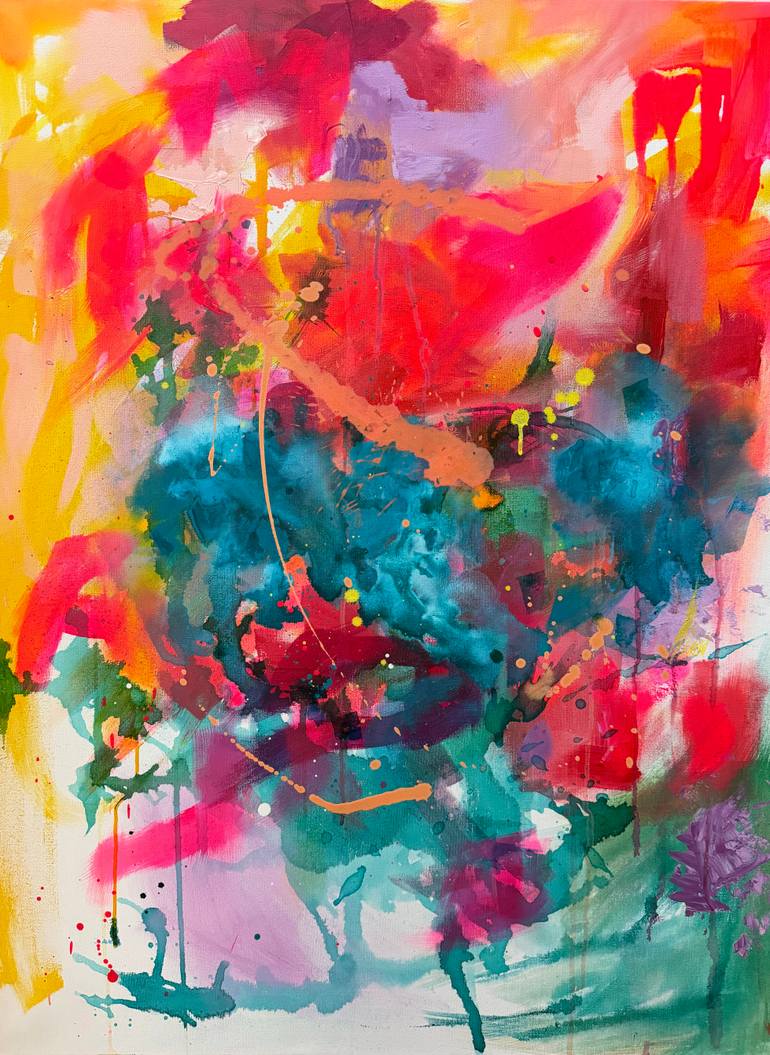 This original abstract painting bursts with movement and vibrant color, layering expressive brushwork, drips, and splashes to create a dynamic, energetic composition. Bold pinks, reds, teals, and yellows interact freely, giving the piece a sense of spontaneity and joy. A one-of-a-kind artwork design...