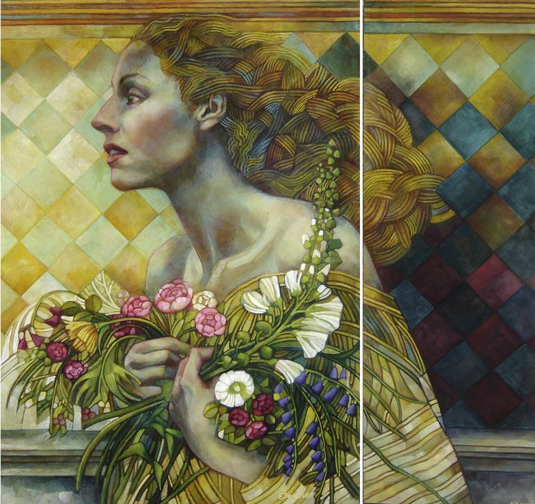 Elisabetta Trevisan, inspired by the Renaissance and the Pre-Raphaelites with their infamous depiction of female figures in interior and exterior environments, has created a stunning oeuvre dominated by women with beautiful hair styles and flowing fabrics. Paying attention to detail, her figures are engaged with their surrounding environment and in some cases they even become an integral part of it. Her painstakingly attention to detail is further explored in the depiction of those environments, ranging from flowers, plants, the sea, the sky to interiors. The play between light and shadow further contributes to creating an atmospheric scenery for both the depicted figure and the viewer. What has enabled her to create such pictures - serene and full of vitality at the same time - is the use of tempera and water-soluble pencils. She has provided clear evidence of her talent with those two media, as can be seen by the airy and mythical - in a way - figures she has created. What one should also pay attention to is the still lives she has produced, which either form the subject of a picture on its own right or part of the background, complementing the sensuality of unique beauty of each work. Klairi Angelou, University of Bristol, 2013 Elisabetta Trevisan was born in 1957 in Merano, a town in northern Italy bordering on Austria. She attended the art school of Padua. Her father is a famous illustrator and cartoonist.She lives and works in Treviso (IT)She has always devoted herself mainly to painting. She realizes her paintings using Medium Density panels on which she works mixing different techniques: gouache, pastel, watercolour. However, she does not forget minor arts, as she also decorates on backed clay, glass, wood, fabrics, mural surfaces and self-made Papier Mach objects. She has also: contributed as an illustrator to many magazines, illustrated a children book on ecology in collaboration with Ente Parco Fiume Sile, painted a collectors pack of tarots (72 cards)ed. "Lo Scarabeo" Torino It, realized settings for animated films for the television.