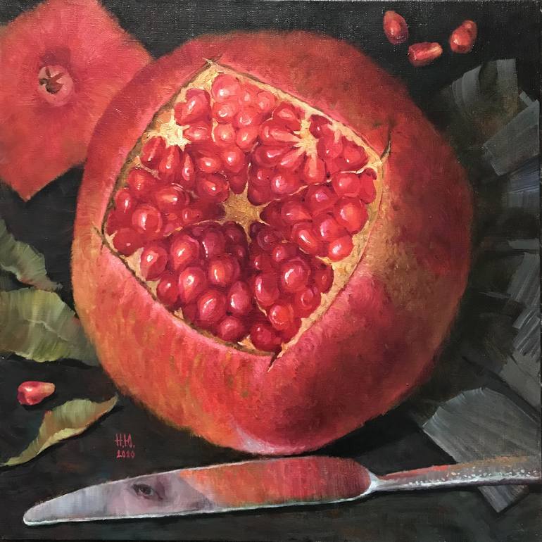 In art, the pomegranate fruit has many different symbolic meanings: abundance, prosperity, eternal life. In a still life, I portrayed a grenade and a man who is trying to look deep into these symbols.