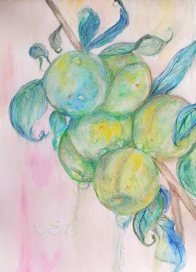 A whisper of stillness hangs in the air of this ethereal watercolor. Six pale green fruits rest gently upon their branch — not yet ripe, not yet spoken. Their hues shimmer between soft citrus yellow, dew-washed blue, and tender emerald, as if caught mid-breath by the morning light. Each sphere seems...