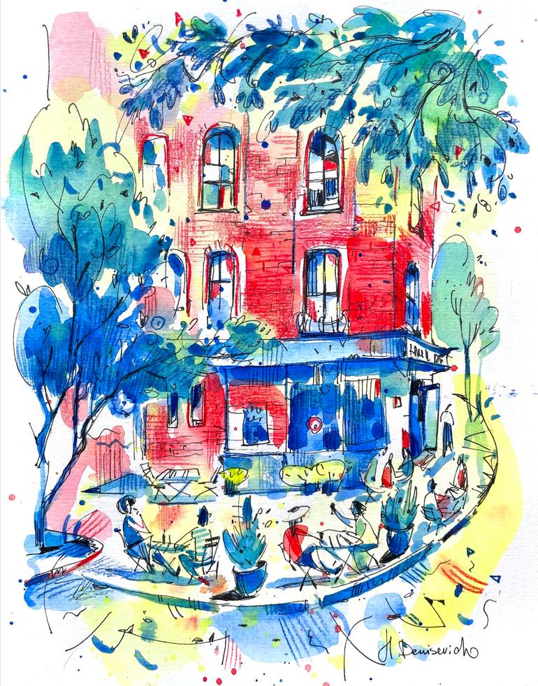 River Deli Restaurant-Brooklyn Heights NYC Medium: Watercolor on paper, Ink Size: 9x12 in This art watercolor was inspired by one weekend summer vibes in Brooklyn Heights. With watercolor paint I wanted to capture the bright and hot colors of this summer day for expressing the contrast of cold sha...