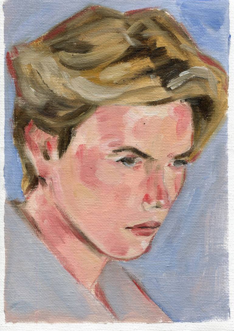 An oil painting on canvas portraying actor River Phoenix. This minimalistic artwork features simple brushstrokes and a light blue background, capturing the essence of the actor with clean lines and a subtle, refined style. The piece is inspired by minimalistic art, emphasizing simplicity and eleganc...