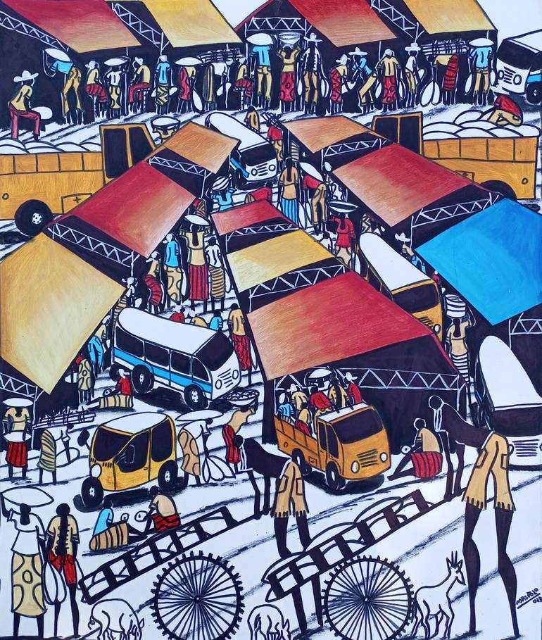 ROAD TRANSPORT PAINTING You can see passengers gathered in bus station. Buses, bicycles... This is a reality, across Afro countries... Very beautiful painting with special style ( orange, yellow, black, white, blue colors, geometric shapes...) - Original acrylic painting - Large painting - Heigh...