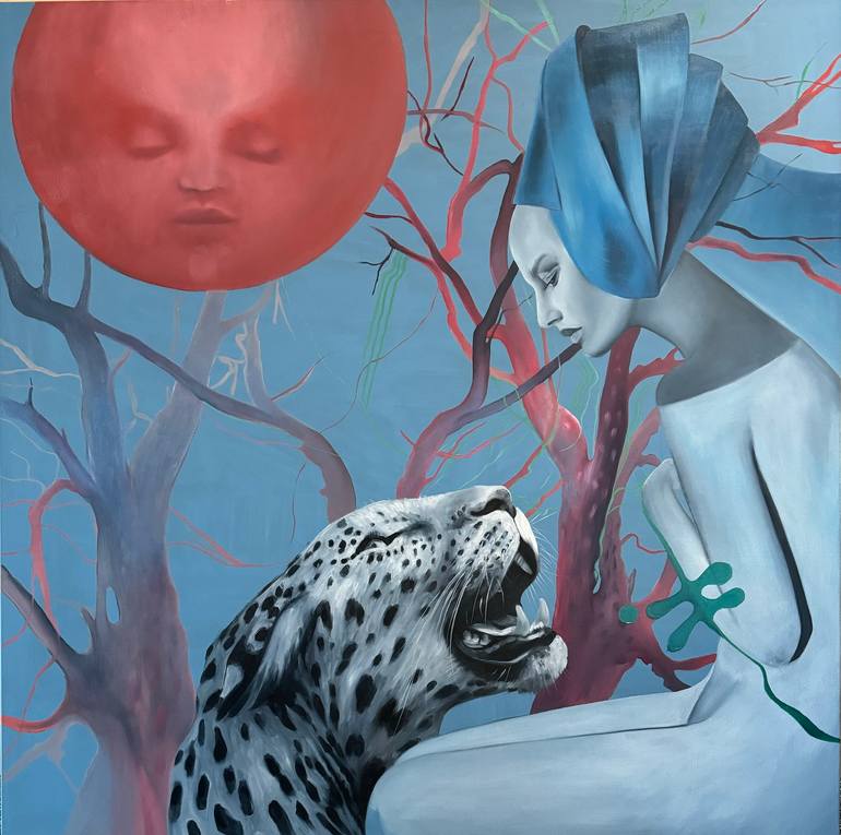 In my painting, I depict a girl in a white dress seated calmly. Resting on her lap is the head of a snow leopard, creating an image of tenderness and connection to nature. In the upper left corner of the canvas, a red moon with a human face rises, adding an element of mystery and mystique to the pie...