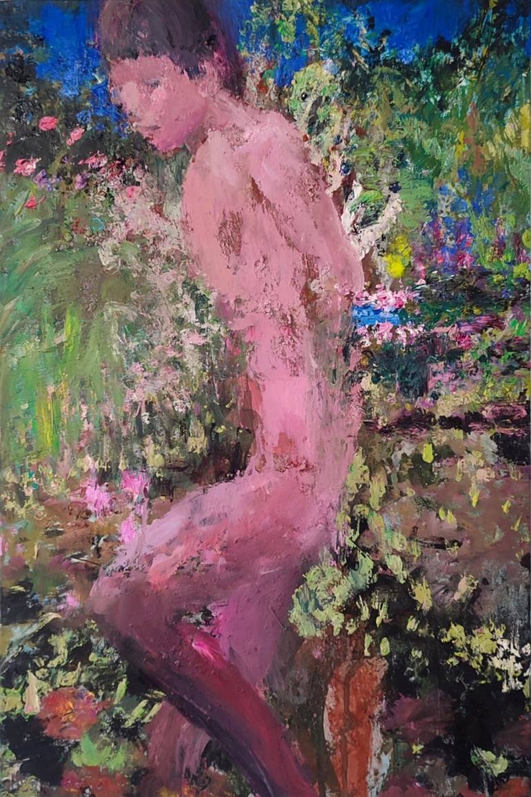 Oil and acrylic painting on canvas with brush, rag, and hands, born one night after seeing the wonderful images of Roberta's trip to Laos. An unfinished painting, left to the shimmering colours of a thick, magical nature. Accompanied on the back by the Certificate of Authenticity and complete with ...