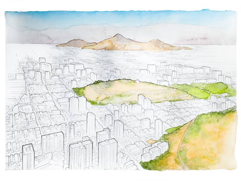 Subject: Santiago, Chile Description: This watercolor painting captures the bustling cityscape of Santiago, Chile from a unique perspective. The view highlights Cerro Blanco and Cerro Renca, verdant hill islands that emerge from the grid of the city, providing a striking contrast to the chaotic urb...