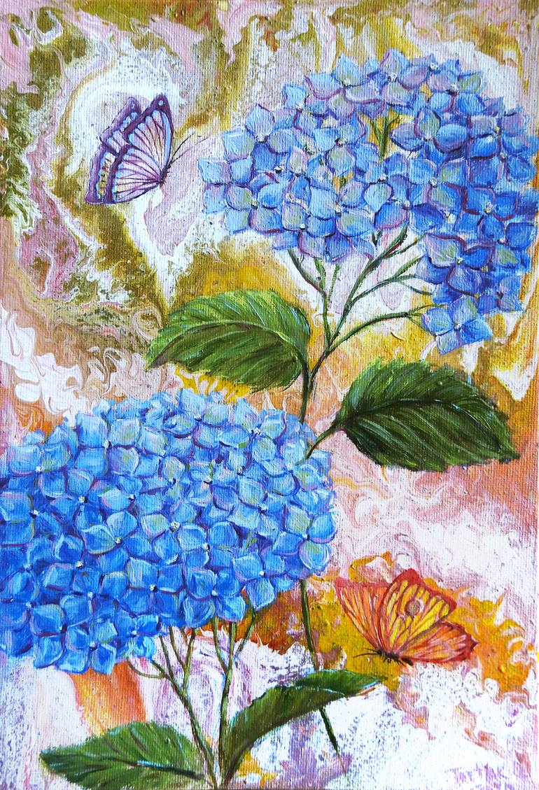 Oil painting of Hydrangeas and butterflies on the pink fluid acrylic background. Serie "Abstract Flowers" This series of artworks was born as a result of the search to show unconscious and conscious in one piece of art. The acrylic abstract background was made during a meditation, then, in a normal ...