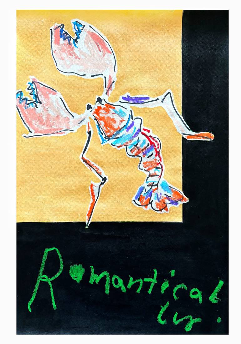 Lobster is romantic. Acrylic and oil sticks on acid free paper.