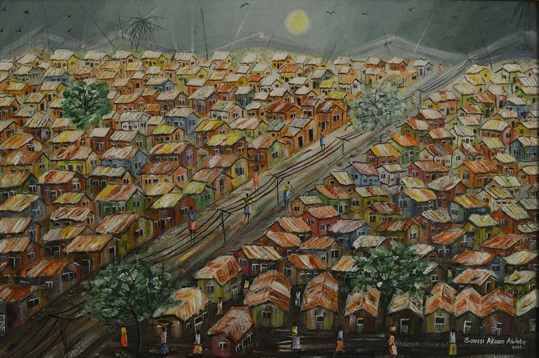 This art piece depicts the rural settings and arrangements of buildings in the western part of Africa in their late years of existence. The view of the rooftops are artistically fascinating.