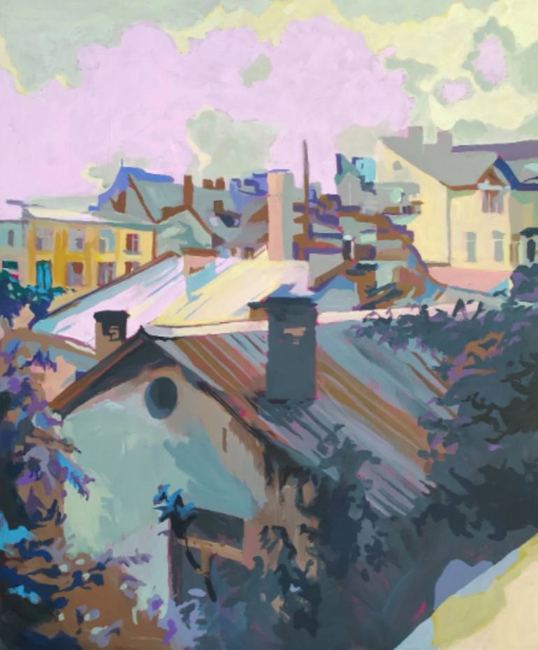 This picture is like a window that invites do a step into a world washed anew by the gentle touch of rain, where the sky blushes in hues of pink and the clouds dance in shades of gold. In 'Roofs after the Rain,' every stroke captures the ethereal beauty of a moment suspended in time. The wet roofs g...