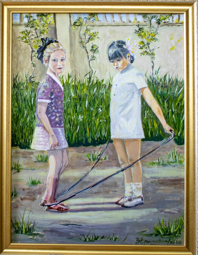 This is a real story from the life of an artist. Quite a long time has passed since that moment. However, the smells of summer, the noise of a children's play track are still in my memory. And its return to an amazing time of our life - to childhood. Handmade oil painting.