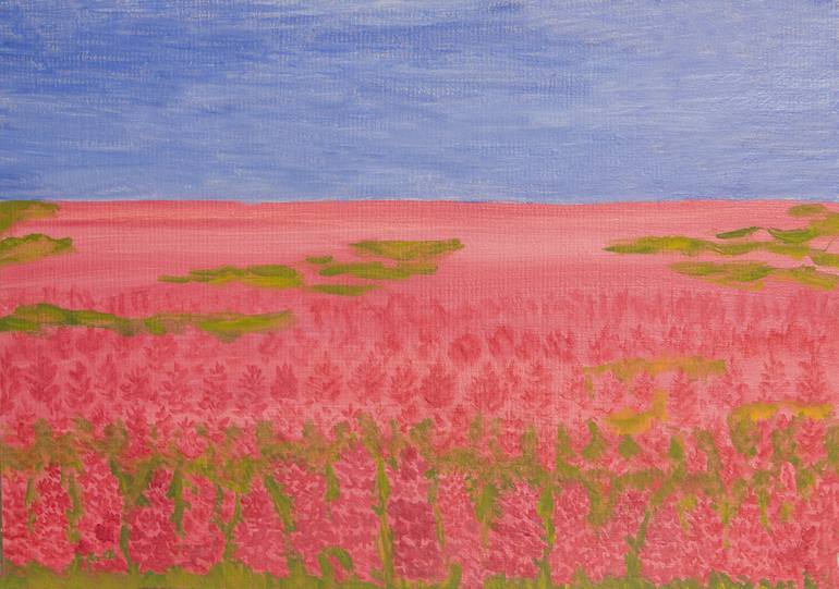 Summer landscape - meadow in blossom with wild flower rose-bay (willow-weed, fire-weed), oil painting on board.