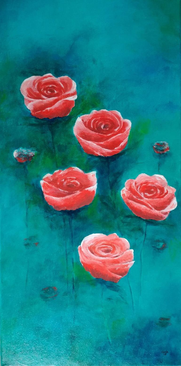 Expressionism acrylic painting of red roses on a blue/green background. I always love to paint flowers, they belong in nature.