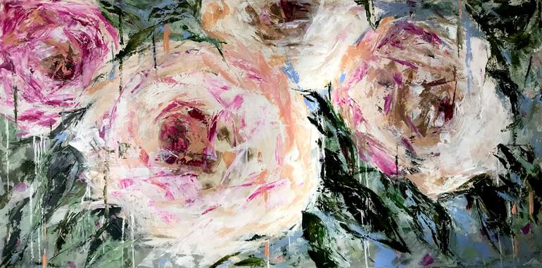 Acrylic Paint on canvas, stretched and ready to hang. Signed with a certificate of authenticity. Endless inspiration in my garden - roses just complete my day. love the smell, feel and look of roses and wanted to convey this feeling with this piece. It is gentle yet dramatic and large scale art th...