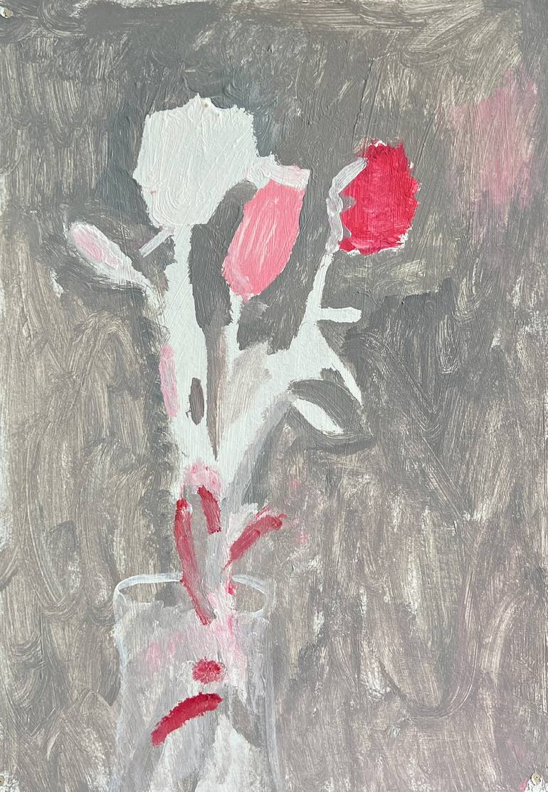 These flowers were given to me by my grandmother. I wanted to capture them touching, tender and dear to me. I used cardboard and acrylic paints.