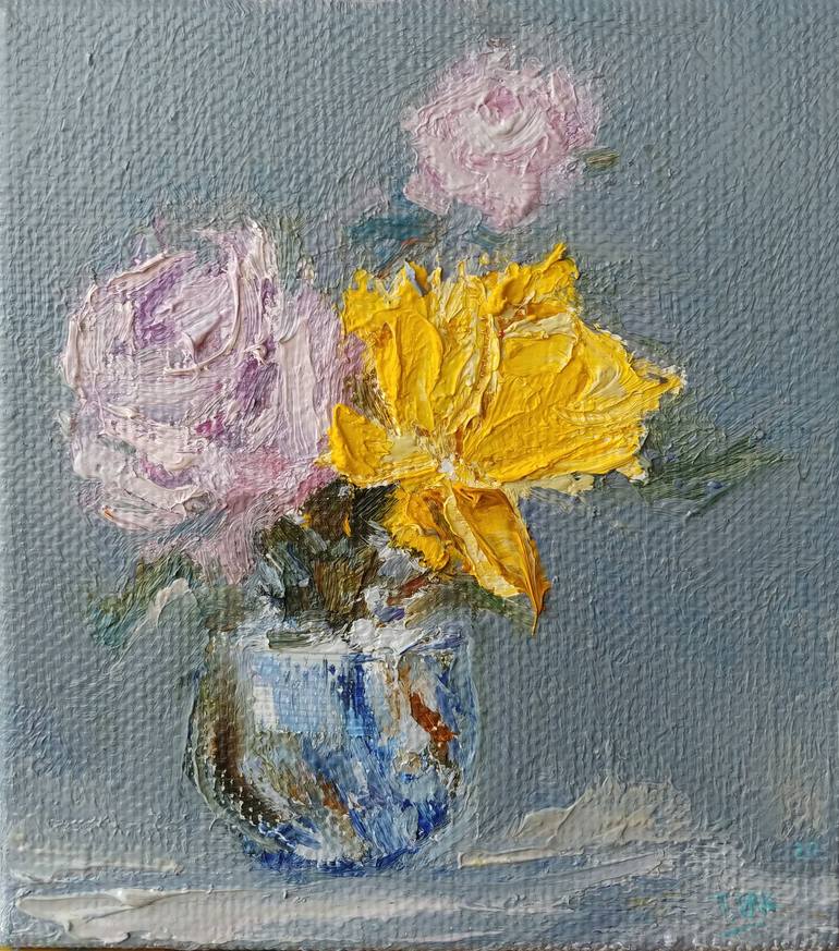 Original oil painting full of rich and yummy textures by artist Olena Tymoshchuk "Roses" 20 X 18 CM Canvas, oil Signed on the front and back Dated 2020 Rose flowers inspired me to write this work. They are light, windy, soaring, give love and tranquility. I love flowers very much, they bring joy...