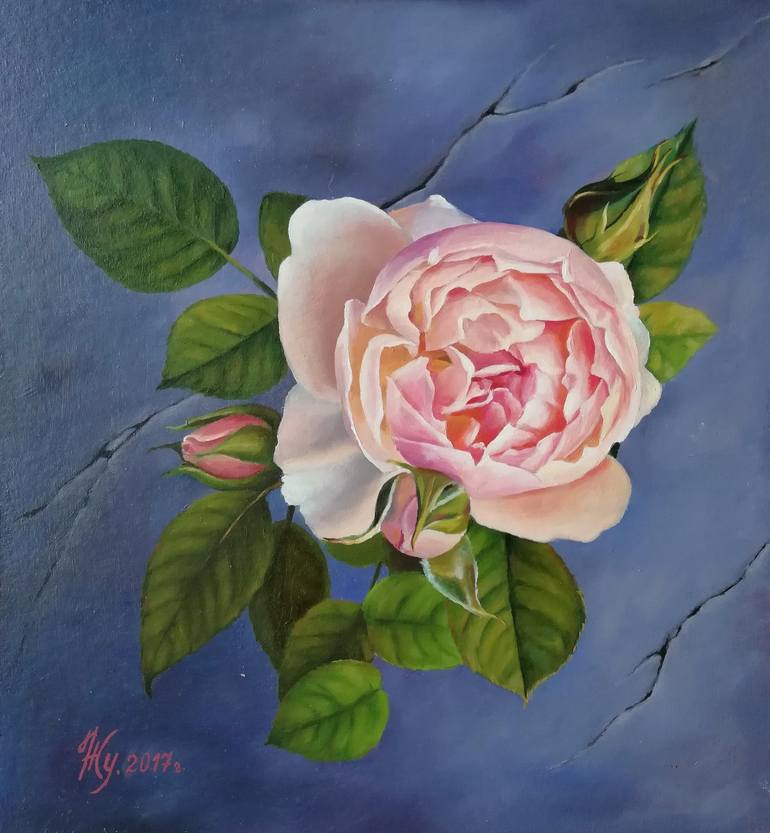 The year : 2017. Size : 9 х 9,8 х 0,07 inches Technique: oil painting, primed cardboard Style: realism, visual art painting “Rosette” A beautiful pink rose on a purple background, painted with oil paints on cardboard. Each petal and leaf is written with a small thin brush, in the technique...